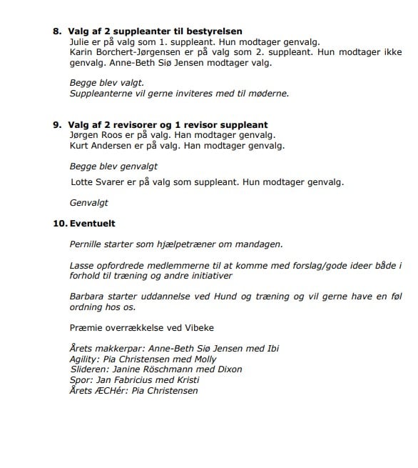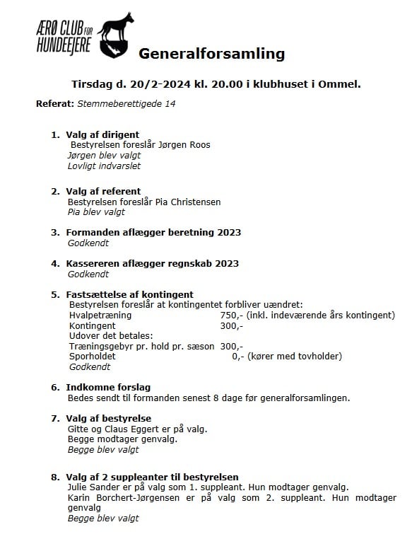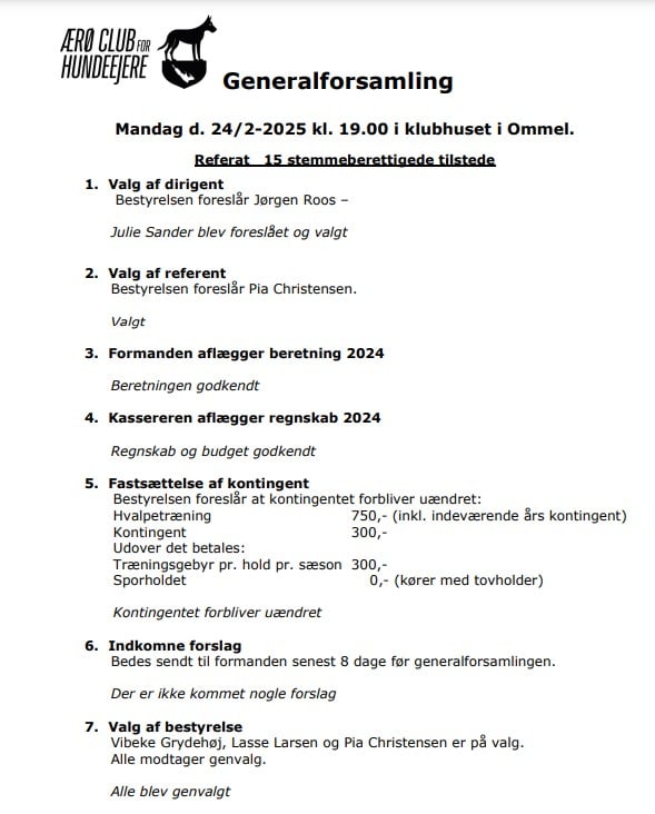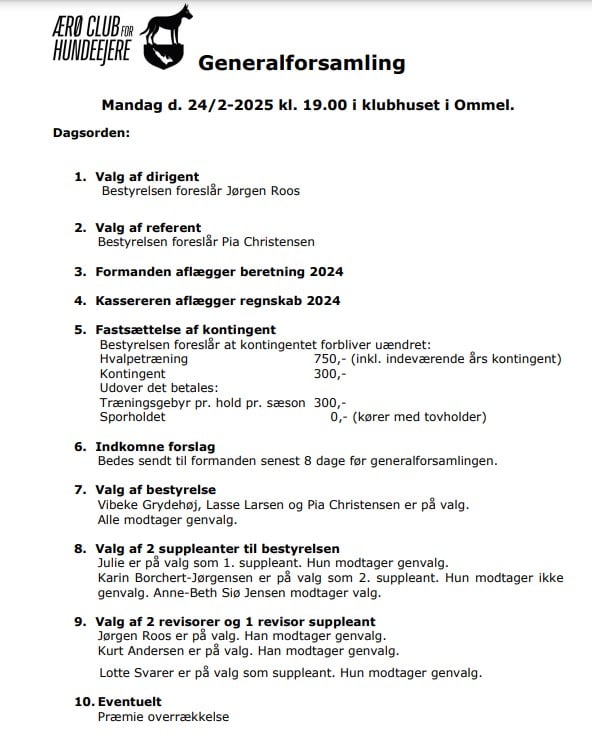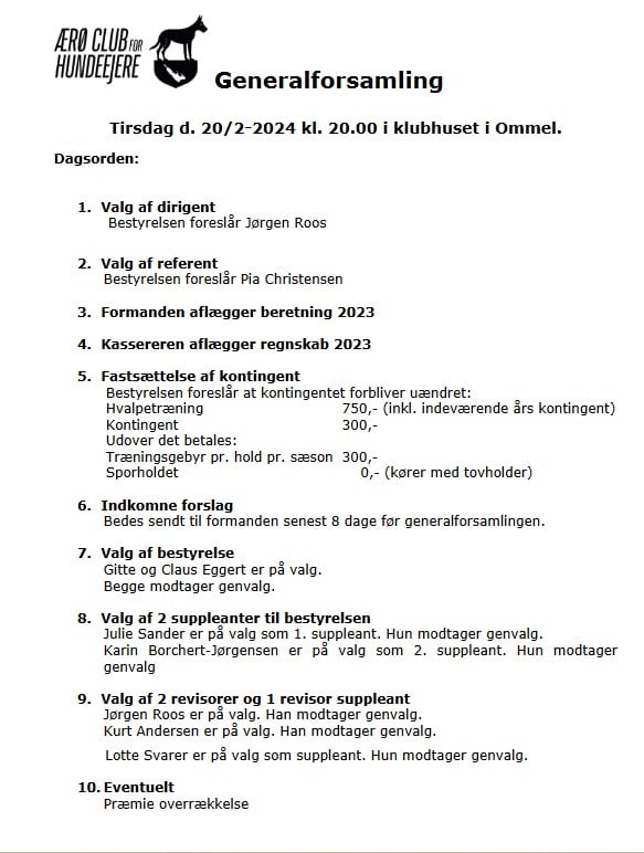 Bedes sendt til formanden senest 8 dage før generalforsamlingen.